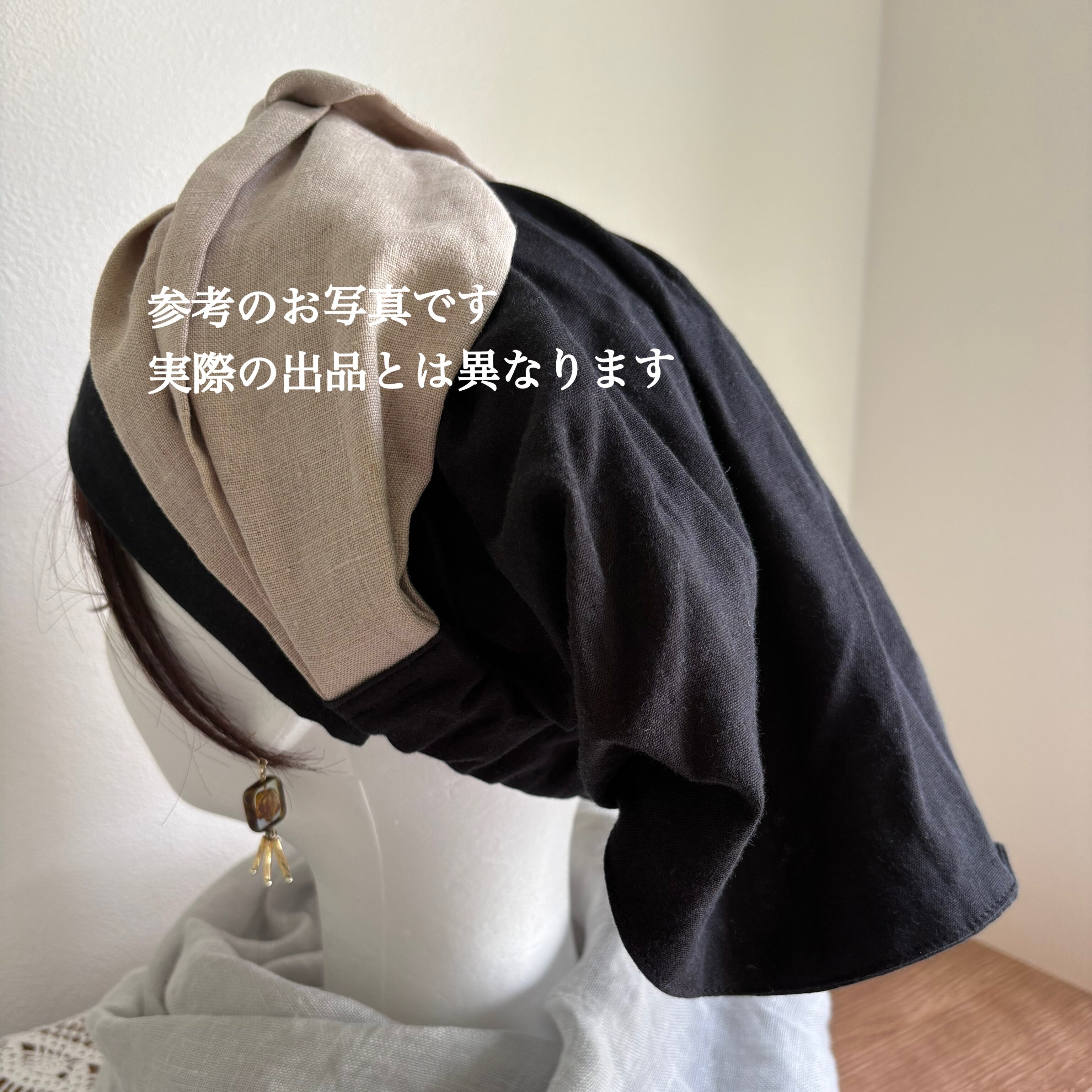 三角巾とターバンをミックスしたデザインで、さっと被るだけで自然なふんわりシルエットに整います。